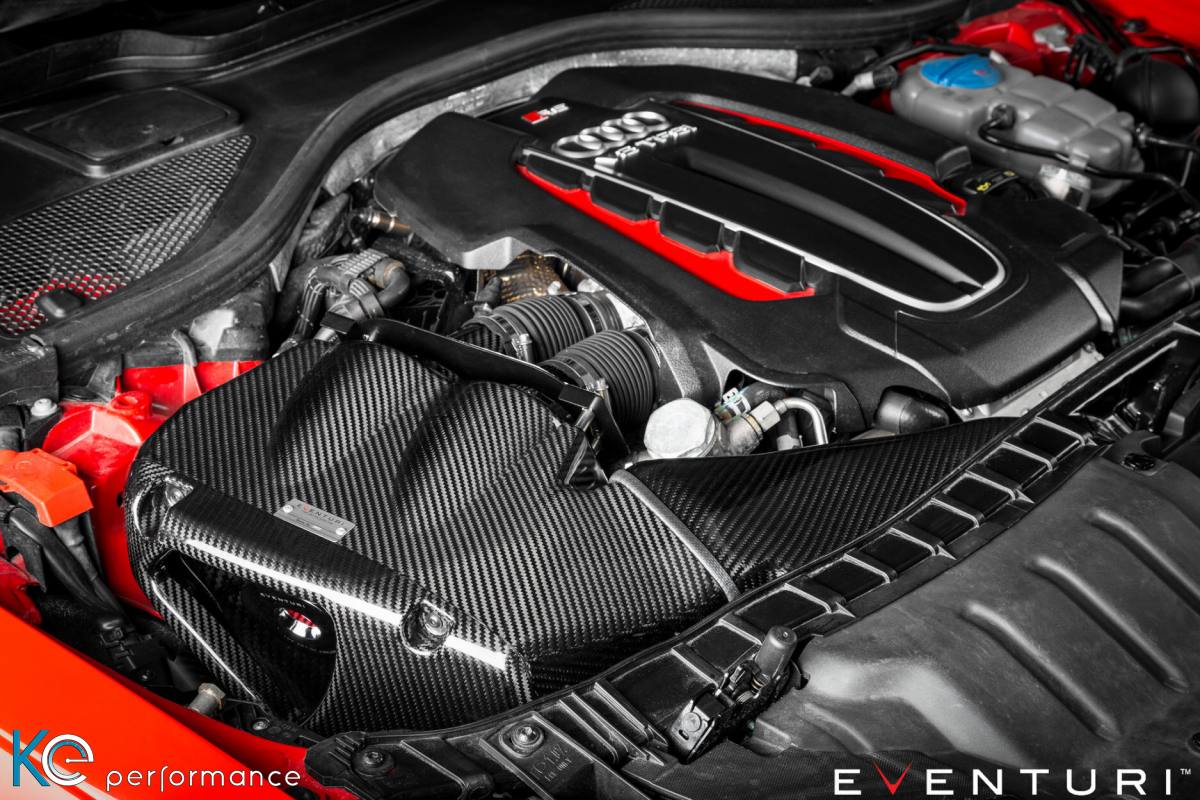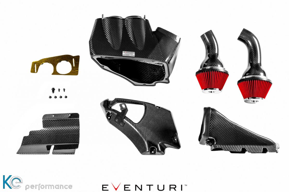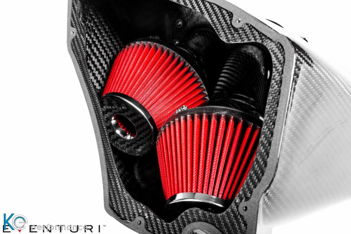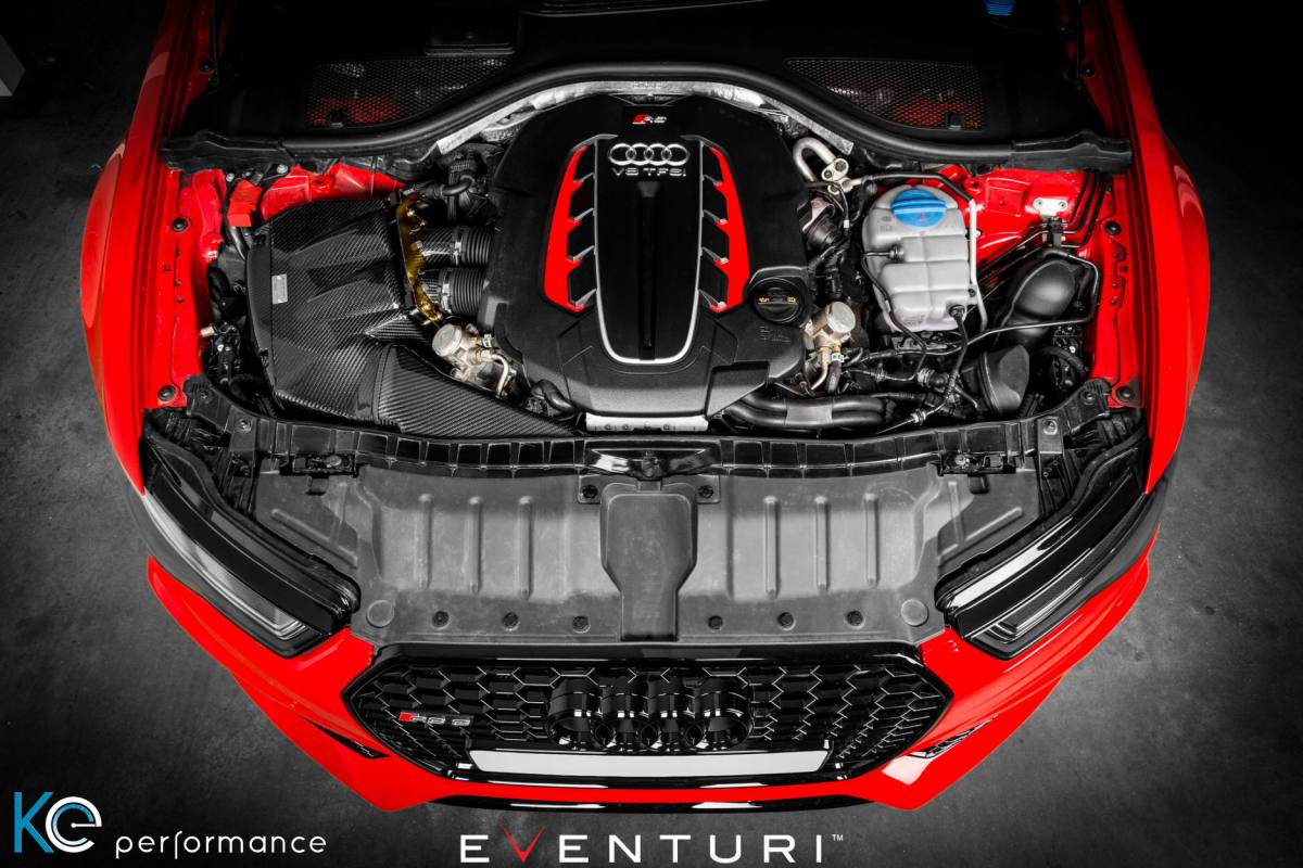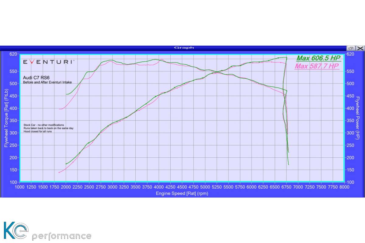 Leistungsgewinn: 15-19hp, 13-17ft-lbV-Box-Beschleunigung : 60-130mph um 0,4 Sekunden reduziertDas Audi C7 S6/S7 Eventuri Ansaugsystem setzt einen neuen Maßstab für das Ansaugsystem auf dieser Plattform. Es wurde entwickelt, um zwei Ziele zu erreichen - 1) Die Turboeinlasspfade zu entlasten. 2) Aufrechterhaltung niedriger Einlasstemperaturen. Das erste Ziel wurde erreicht, indem jeder Turbo mit einem separaten Filter und Venturi Trichter ausgestattet wurde, um den Luftwiderstand zu reduzieren und den Turbos eine effizientere Arbeit zu ermöglichen. Das zweite Ziel wurde dadurch erreicht, dass die Filter in einer Carbon-Luftkammer eingeschlossen und mit einer zusätzlichen, hinter dem Frontgitter angebrachten Schaufel beschickt wurden. Der Motorraum des C7 RS6/RS7 hat mehrere Wärmequellen aus verschiedenen Richtungen, so dass eine einfache Konfiguration von offenen Filtern und Abschirmungen zu höheren IAT-Werten führen würde. Unser Carbon-Airbox-Gehäuse wurde so konzipiert, dass das verfügbare Volumen maximal genutzt und alle Wärmequellen blockiert werden. Die sich daraus ergebenden Leistungssteigerungen und die Ästhetik sind für den C7 S6/S7 branchenweit führend.Der Eventuri-UnterschiedDas C7 S6/S7 Eventuri-System verwendet 2 Eventuri Trichter, die an den Filtern montiert sind und nahtlos in die Turborohre übergehen. Diese bieten einen aerodynamisch effizienten Luftstromweg von den Filtern zu den Turbos. Nicht nur ein weiterer Konusfilter mit einem Hitzeschild, sondern ein einzigartiges Design, das den Venturi-Effekt hervorruft und eine laminare Strömung durch die Rohre ermöglicht, wodurch der Widerstand der Turbos reduziert wird.