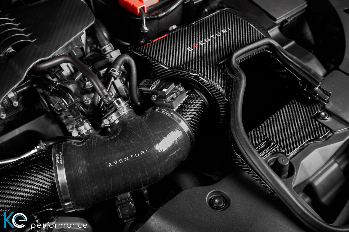 Das Ansaugsystem für den Honda Civic Type-R FK8 war für die Flugzeugingenieure von Eventuri eine neue Art der Herausforderung, die viel Erfindergeist und technisches Know-How erforderte. Das Problem war die Position der OEM Airbox, die im FK8 direkt vor dem Lüfter des Kühlers sitzt. Diese Anordnung stellt das offene Filtersystem von Eventuri vor eine Herausforderung - wie stellt man sicher, dass das Ansaugsystem keine heiße Luft aus dem Motorraum zieht? Die Lösung ist eine völlig neue Art von Carbon Scoop, die den frischen Luftstrom aus der Richtung der Kotflügel zieht. Die doppelt so große Öffnung im Vergleich zur original Airbox liegt nicht mehr im Luftstrom des Kühler Lüfters und sorgt so für kühle und gleichmäßige Belüftung. Danach greift der bekannte Effekt der Eventuri Ansaugsysteme auch im Honda Civic Type-R FK8: Der Luftstrom wird über den Kegel im inneren des Filtergehäuses beschleunigt. Die dann gebündelte und gerichtete Luft kommt durch weniger Reibung in der Luftzufuhr mit niedrigeren Temperaturen und gleichmäßiger im Turbo an. Dadurch verbessert sich nicht nur das Ansprechverhalten wesentlich, sondern auch die Leistung steigt. Die Eventuri Honda Civic Type-R FK8 Ansaugung kommt im Lieferumfang mit folgenden Teilen: - Patentierter Eventuri Filter - Vollcarbon Prepreg Airbox - Ansaugrohr aus Vollcarbon - Sekundärer Ansaug-Scoop - Carbon Deckel